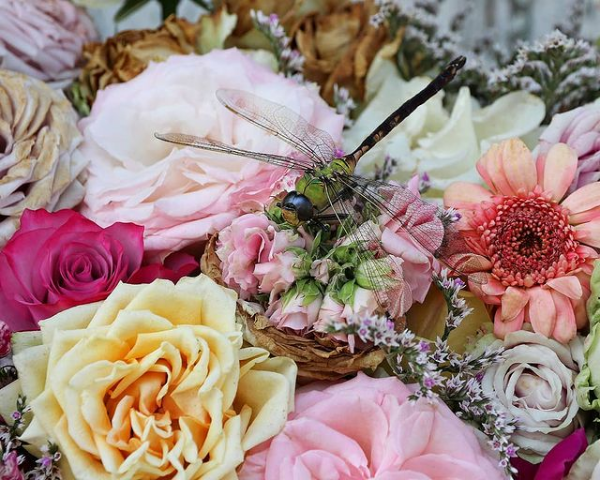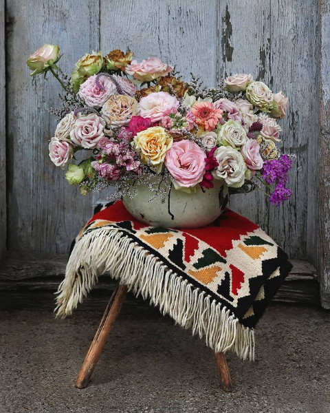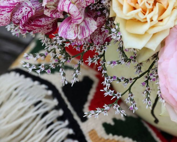 Zavedeni pričama o magiji starih zanata, strpljivim provlačenjima oštrih vunenih niti prilikom izrade jednog ćilima, kreativnim i dubokim promišljanjem o dizajnu i gustini dekorativnih šara i simbola želja nam je bila da kreiramo nežnu cvetnu kompoziciju koja odiše rustikom, etno nasleđem i stvara harmoniju boja, oblika i tekstura. Inspiraciju smo pronašli u folklornim motivima, ornamentici i autentičnim ukrasima koji svojim bogatstvom i raznolikošću krase jednu kulturnu tekovinu i asociraju na čistoću prirode i neiscrpnu živopisnost botaničkih lepota. Raskošnu cvetnu kreaciju pastelnog kolorita satkanu od zrelih domaćih ruža, zevalica, gerbera, limonijuma i deteline smestili smo u dotrajalu metalnu posudu koja je učinila da naša floralna etno skulptura odiše starim, a unosi nešto novo i sveže u prostor.