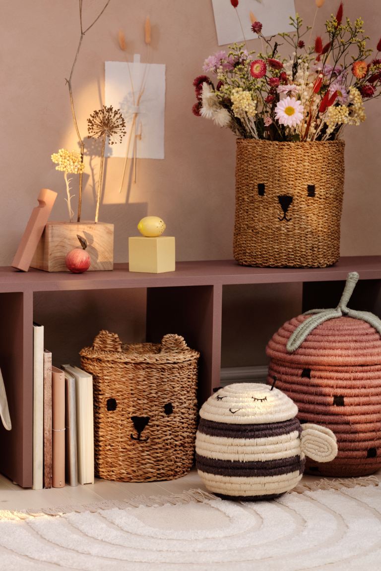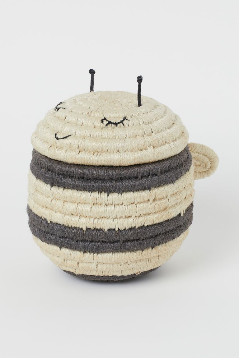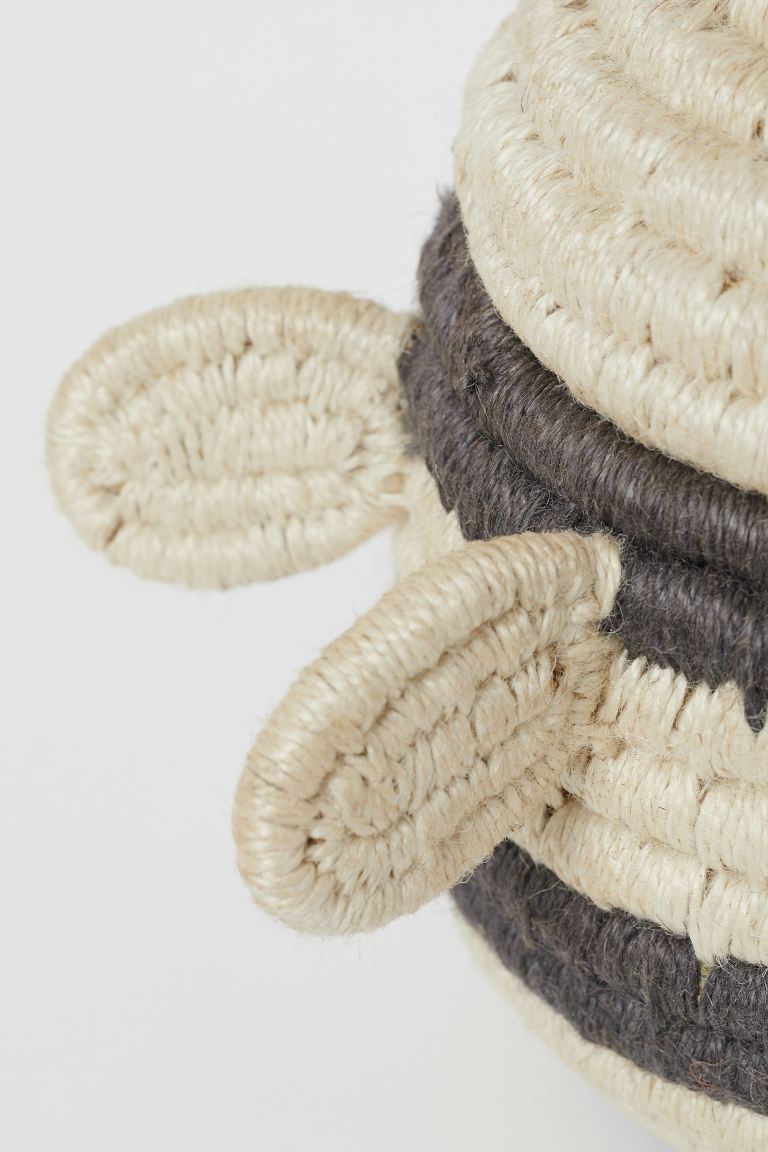 Small, bee-shaped storage basket in braided jute with a lid. Decorated with antennae and wings. Diameter 19 cm. Height 22 cm. Composition Lining: Straw 100%Shell: Jute 100%