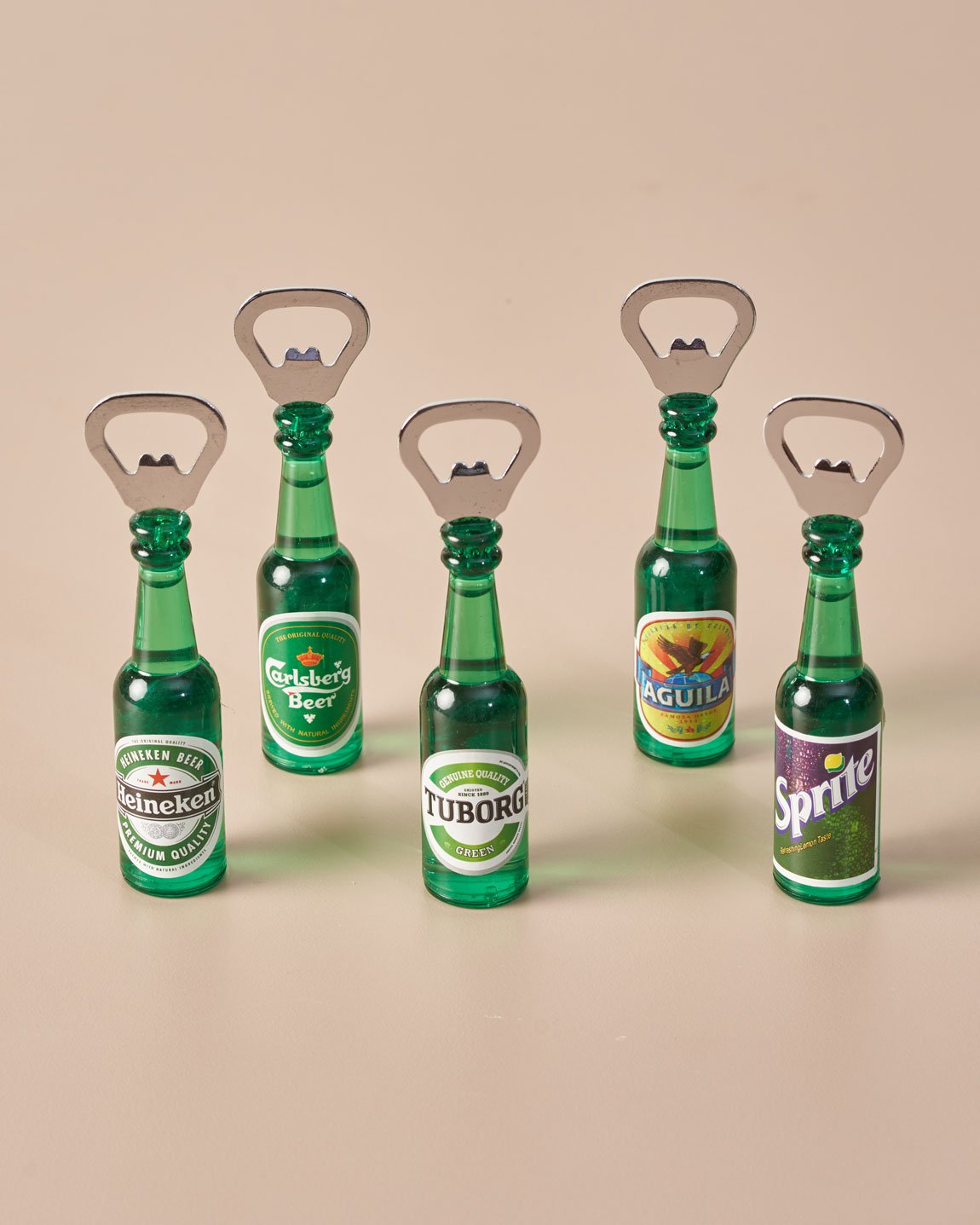 A unique twist to your regular bottle openers. Stick to your fridge door for easy usage. They come in assorted beer and whiskey brand names. Complete your kitchen with this set which looks bold in a man cave or on your kitchen countertop. Easy and fast opening of standard-sized bottle caps. A great gift and addition to any home bar!