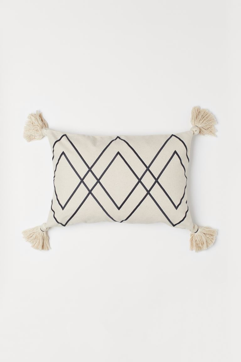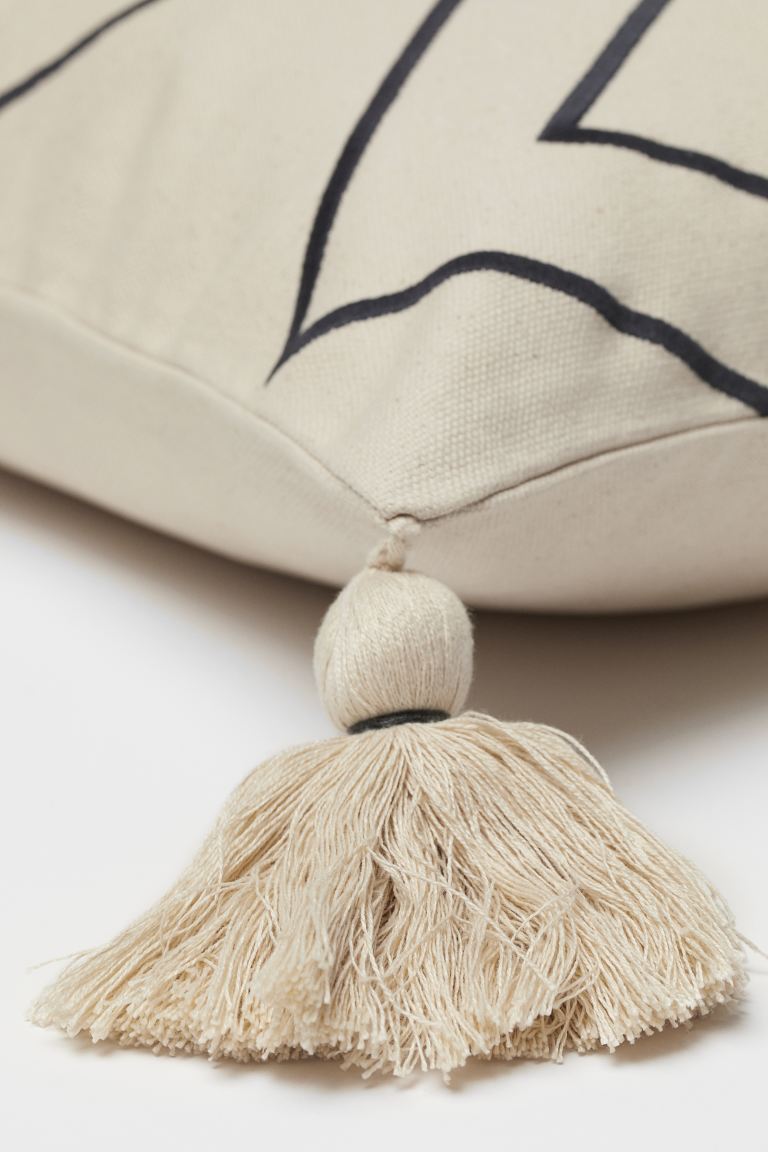 Cushion cover in cotton canvas with an embroidered pattern on the front, tassels at the corners and a concealed zip. Composition Cotton 100%Embroidery: Polyester 100%
